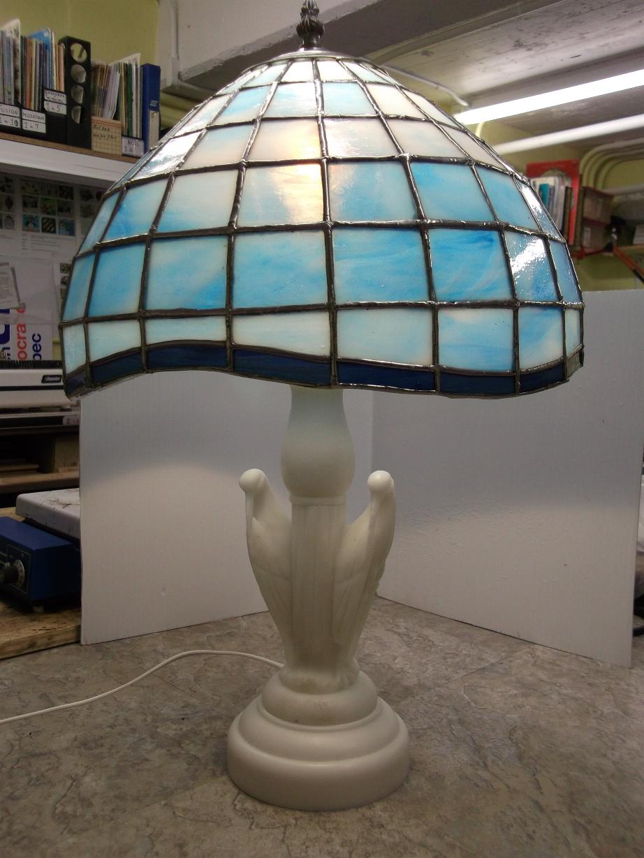 Cours de lampe Tiffany sur moule Ce cours s'adresse aux membres ayant atteints une bonne habileté à faire des vitraux. Il faut prévoir aussi de mettre du temps de travail à la maison entre les cours. Coût : 200$. La carte de membre de 40$ est exigée et la carte loisirs de Beloeil. Matériel : tout le verre et le capuchon sont aux frais de l'élève